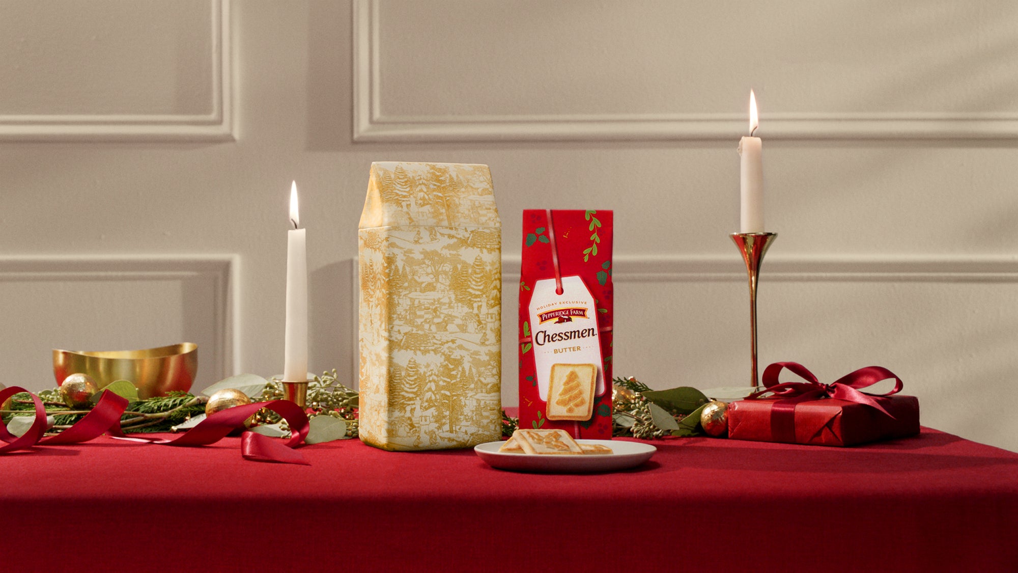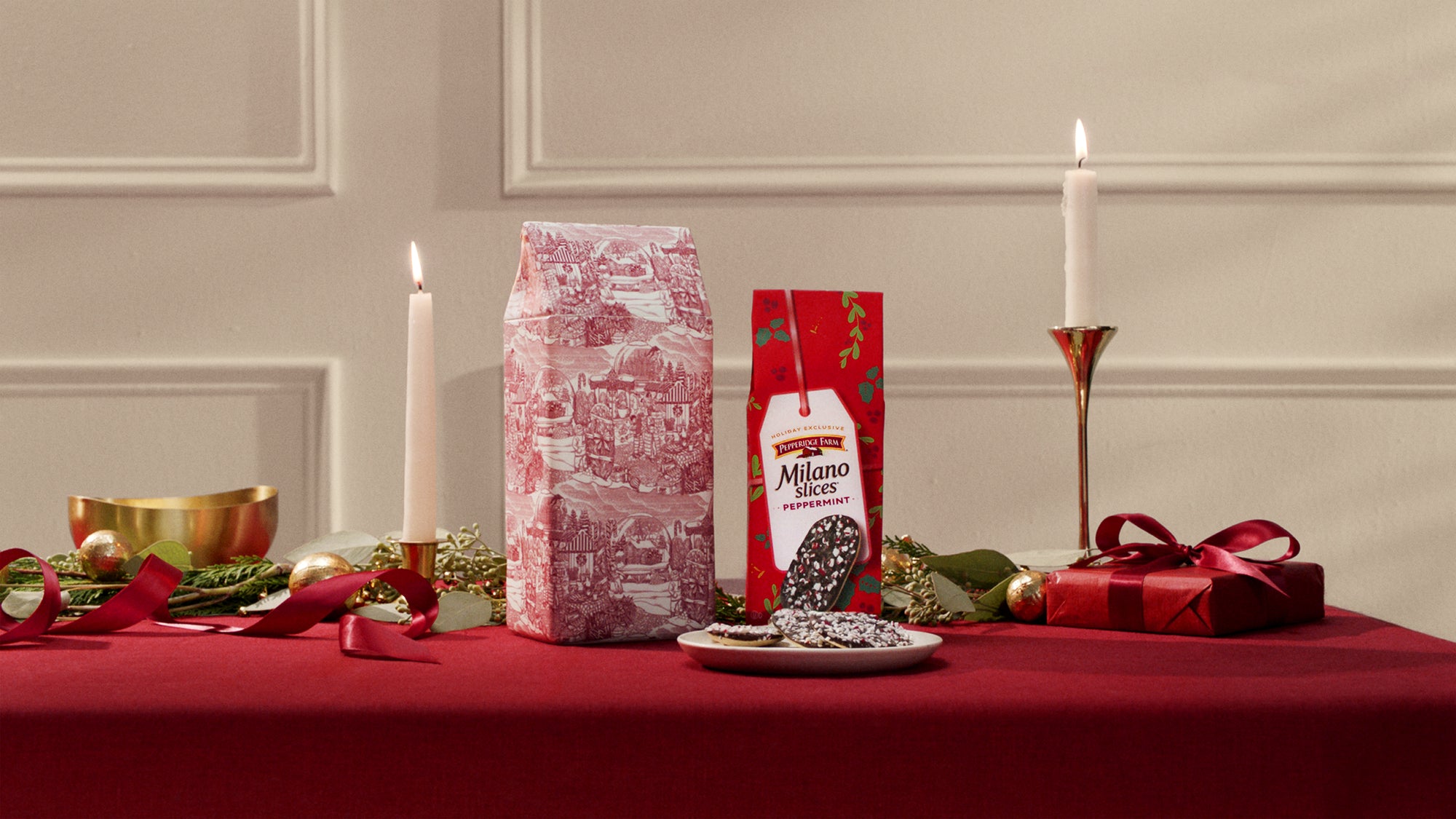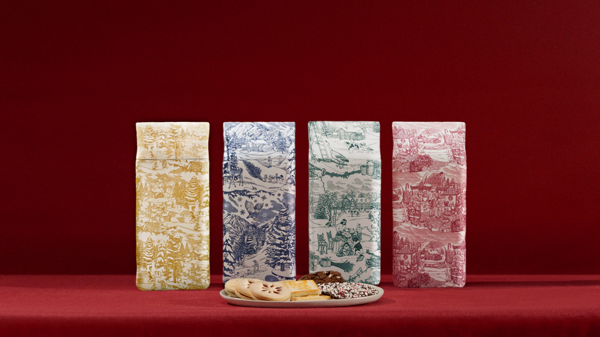 Four of our personal favorite cookies – Milano, Chessmen, Linzer, and Peppermint Chip–play the muse for a suite of cheeky winter wonderland scenes in a festive palette of holiday jewel tones. Highlights include–but certainly aren’t limited to–frisky geese, ice-skating chess pieces, Saint Bernards sneaking a treat from the family dinner table, and tongues affixed to frozen street lamps in the most elevated Dumb and Dumber homage you’ll see all season.