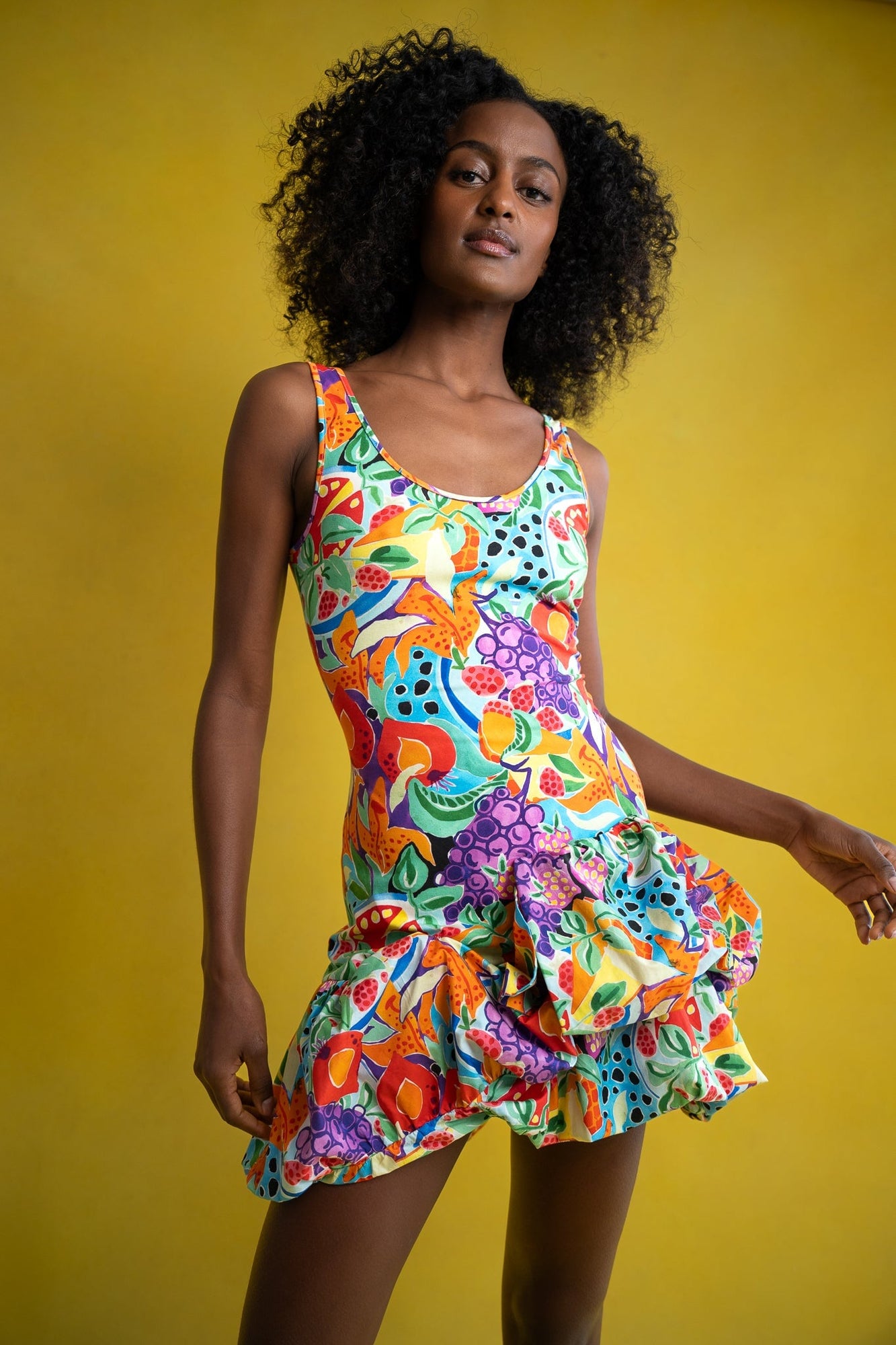 Our latest Cindy may just be the Platonic ideal of a party dress: a jersey bodice ensures comfort from dance floor to bathroom floor and beyond, while clouds of puffy cotton lend the illusion of grace to even the most doubly left-footed. Add a head-turning tropical fruit print, and Life of the Party status has never been more attainable.