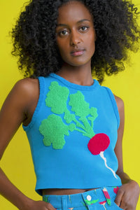 For a vegetable that grows in the dirt, this radish is a deceptively easy way to clean up. A plush 100% cotton knit and sleeveless crew silhouette add a touch of garden glamor to jeans or a layering top, while the larger-than-life fuzzy radish and textured trim is a tactile delight. (Also, a great conversation starter if you'd like someone to touch your boobs.)