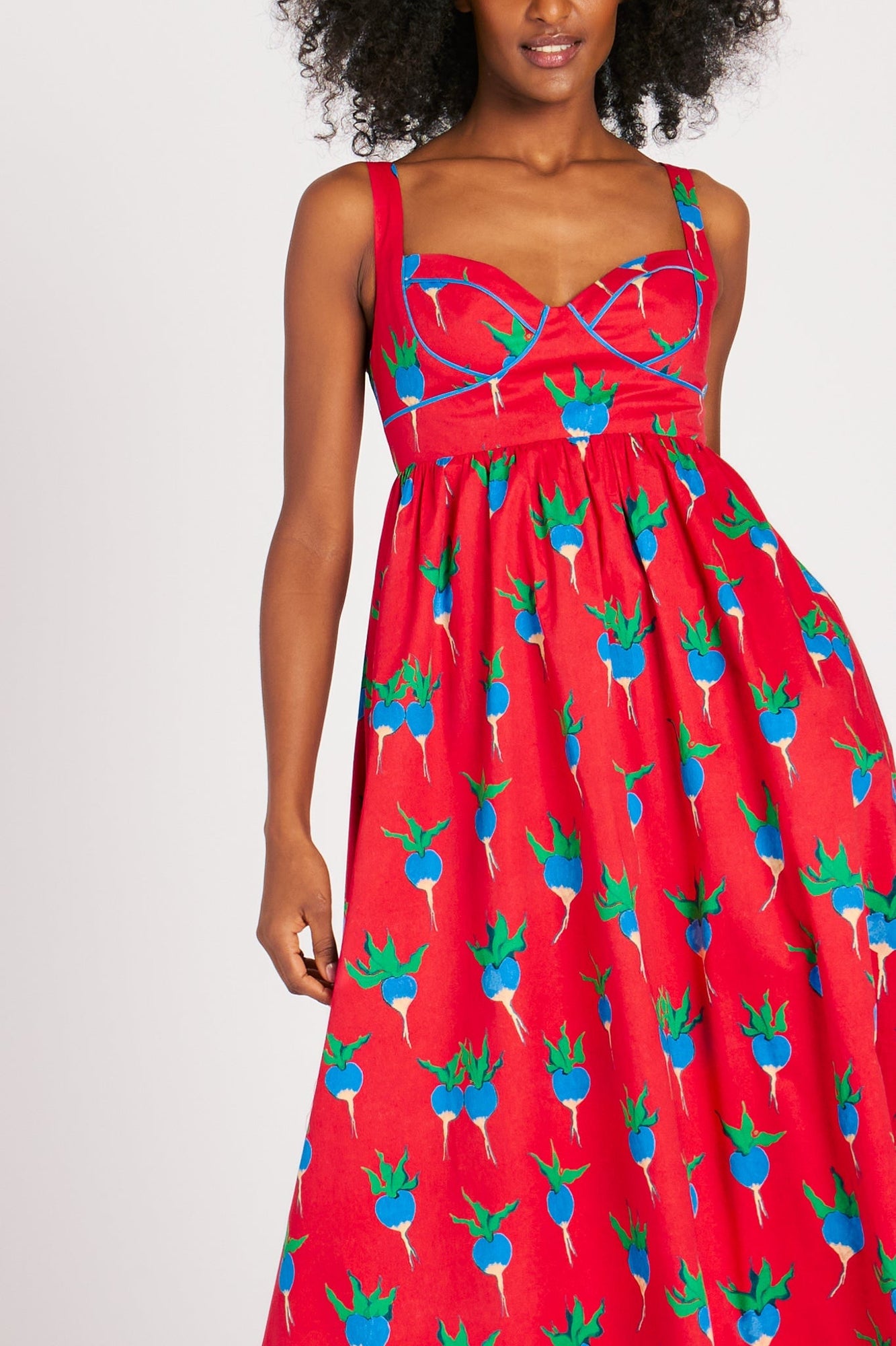Ravishing in radishes! Be the temptress of your local produce plot–every community garden needs one–in our latest Victoria dress. Constructed in decadent cotton sateen, this midi dress features a structured sweetheart neckline, contrast piping, and all-over pop art-esque blue radish print.