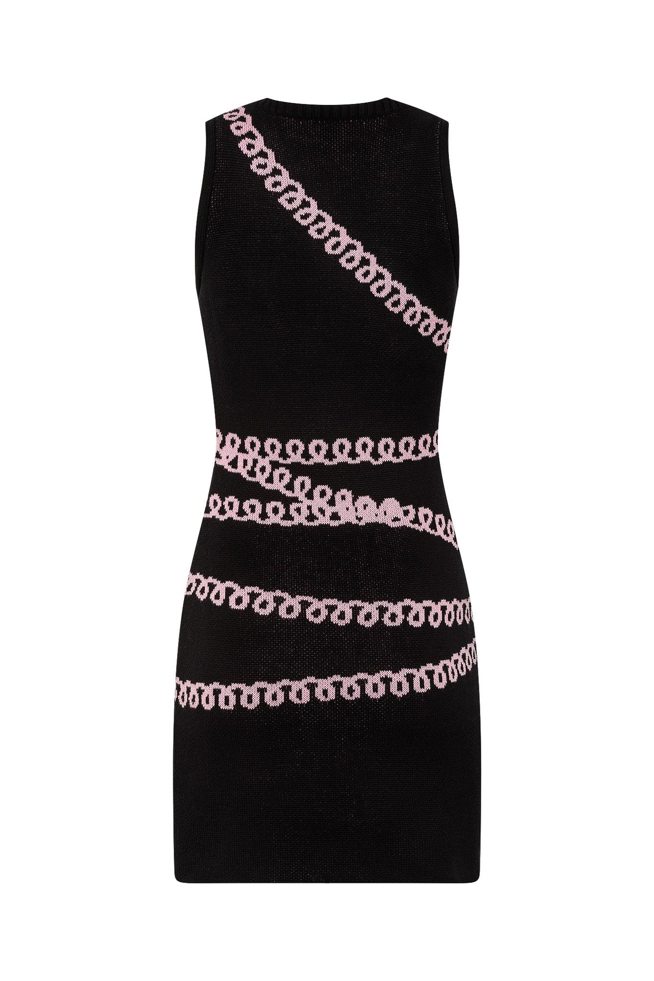 It’s hard to believe that there was a time one’s phone didn’t evoke feelings of anxiety, obligation, and doom. The tactile pleasure of a telephone cord idly wrapped around one’s finger is a bygone delight, but our newest Maddy strives to spark the joy of a good old-fashioned gossip session. This black cotton mini dress features a wraparound pink phone intarsia in a sleeveless silhouette that shines layered or on its own. Throw on over a button-up for a fun office vibe! Pair with a bitchy black heel and order the business woman's special! Go to the bar and drop your head to your chest and pretend to talk into it! Destiny is calling you.