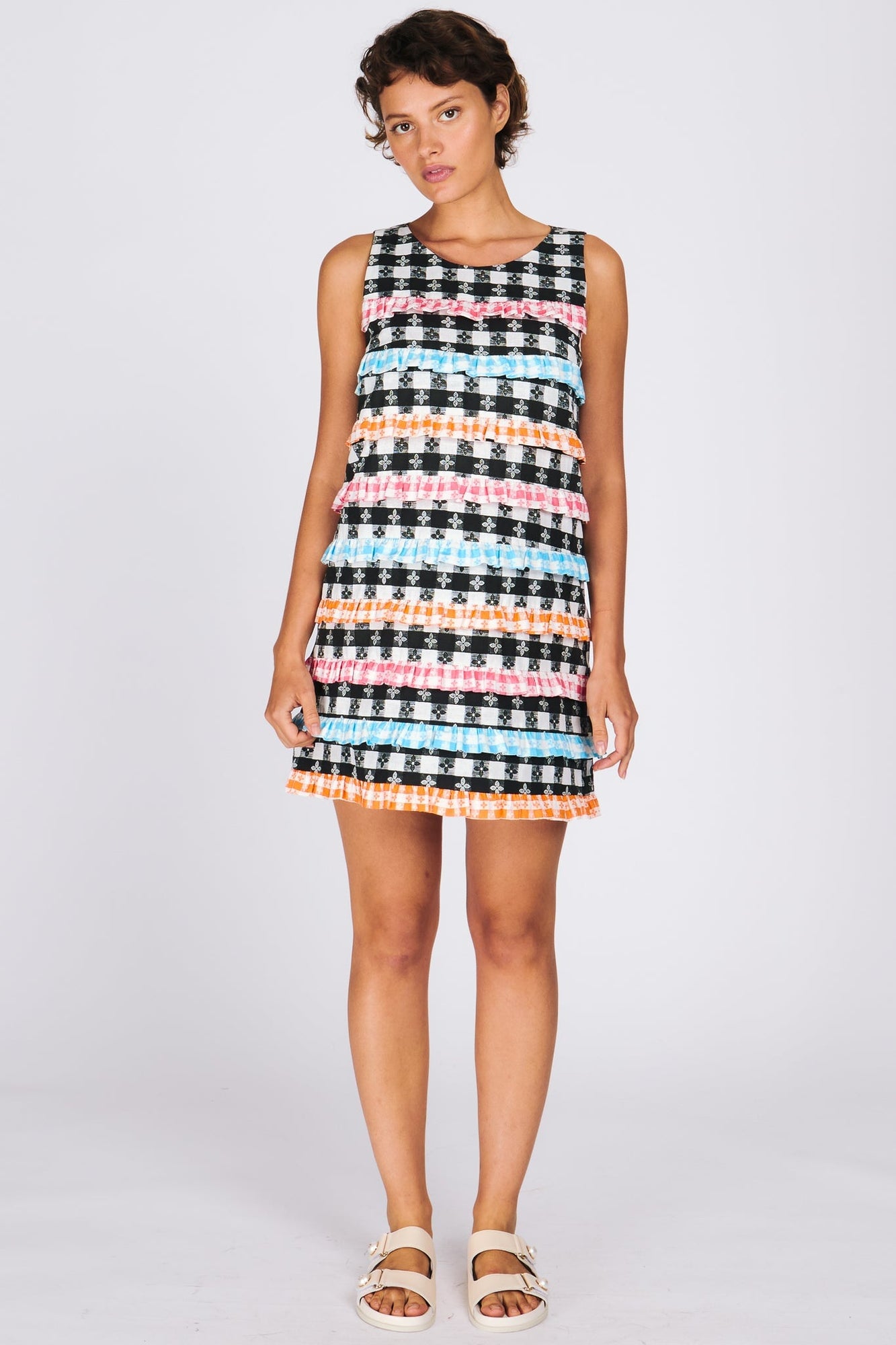 - Mini shift dress with colorblocked ruffle stripes