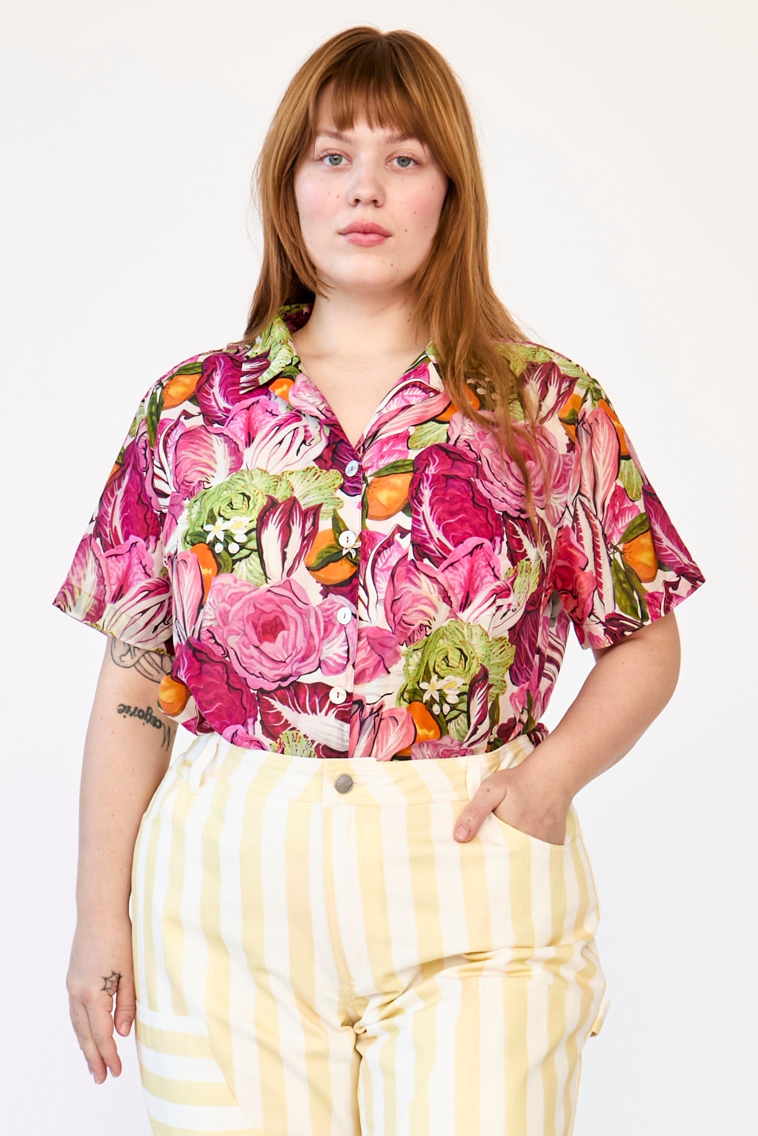 We’re always saying: dazzle ‘em with salad! On our newest Rebecca dress, a sumptuous, slightly psychedelic bounty of bitter radicchio and bright citrus tumble across decadent cotton-silk voile. In addition to approximately 30 daily servings of fruits and vegetables, you’ll find an ankle-skimming hemline, delicate straps, an open back, and a removable oversized bow (that also looks great affixed to your purse or your ponytail, by the by). Wear alone to entrance your local nutritionist, or don under the matching James button-up and truly become a feast for the senses.