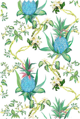 Midcentury-inspired psychedelic blue pineapples sprawl across a garden of elegant tropical flowers, bringing an air of “Grandma’s smoking jazz cigarettes again” to any occasion.