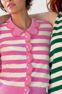 - Pink & white towel striped knit terry fitted cropped cardigan with contrast orange trim