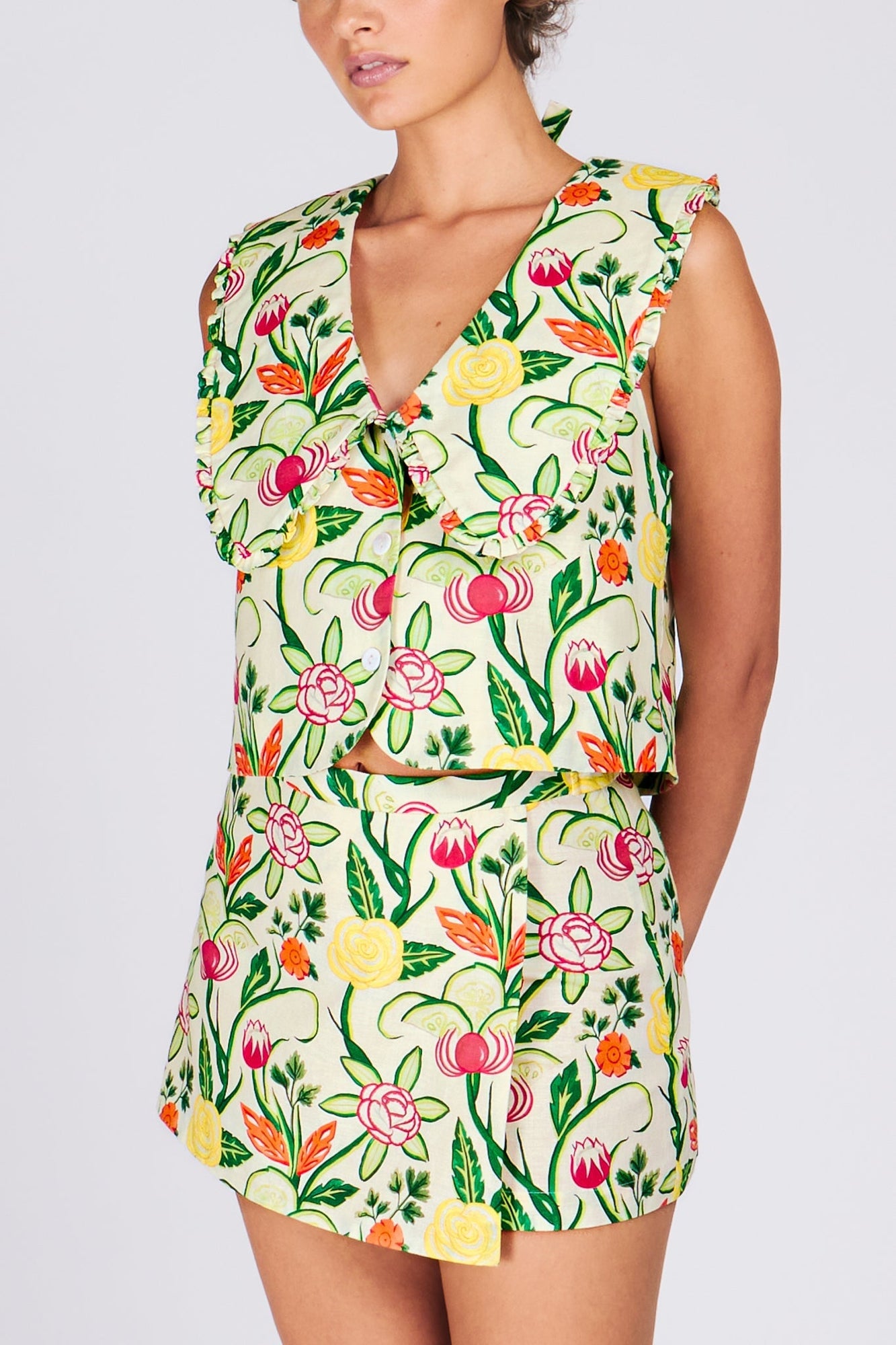- Sleeveless crop top with oversized ruffle collar and curved hem