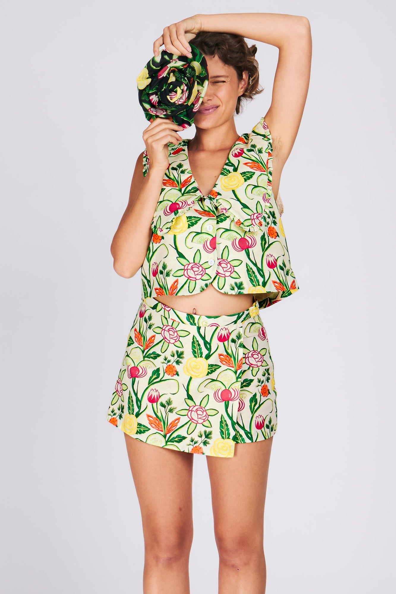 Up there with fanned napkins and tinfoil swans is the lost art of crudité. Here to revive this unsung appetizer is our newest Georgia, a linen-blend button-up that champions the delight of a curl of cucumber and the delicate sensuousness of a radish rosette. Along with enough veggies to stock a rabbit's key party, Georgia has an oversized babydoll collar, a boxy cropped fit, and a dainty tie at the back neckline.