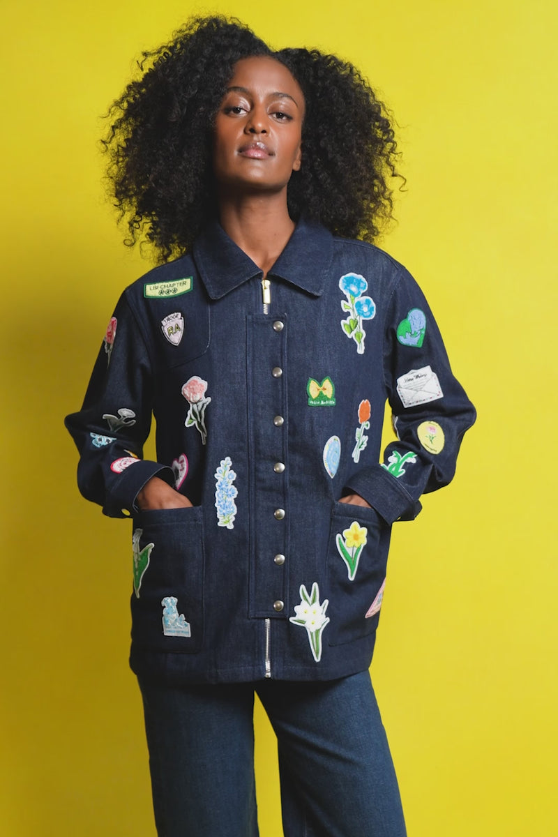 The newest Lizzie jacket invokes your inner crafty aunt, without submitting to hours of macrame! Our best-selling boxy chore coat features structured indigo denim, handy oversized pockets, and now, all-over patches that commemorate Troop RA's greatest achievements. Throw on over a party dress for a dressed-down date night look, or mix-n-match with any of our printed Mike pants.