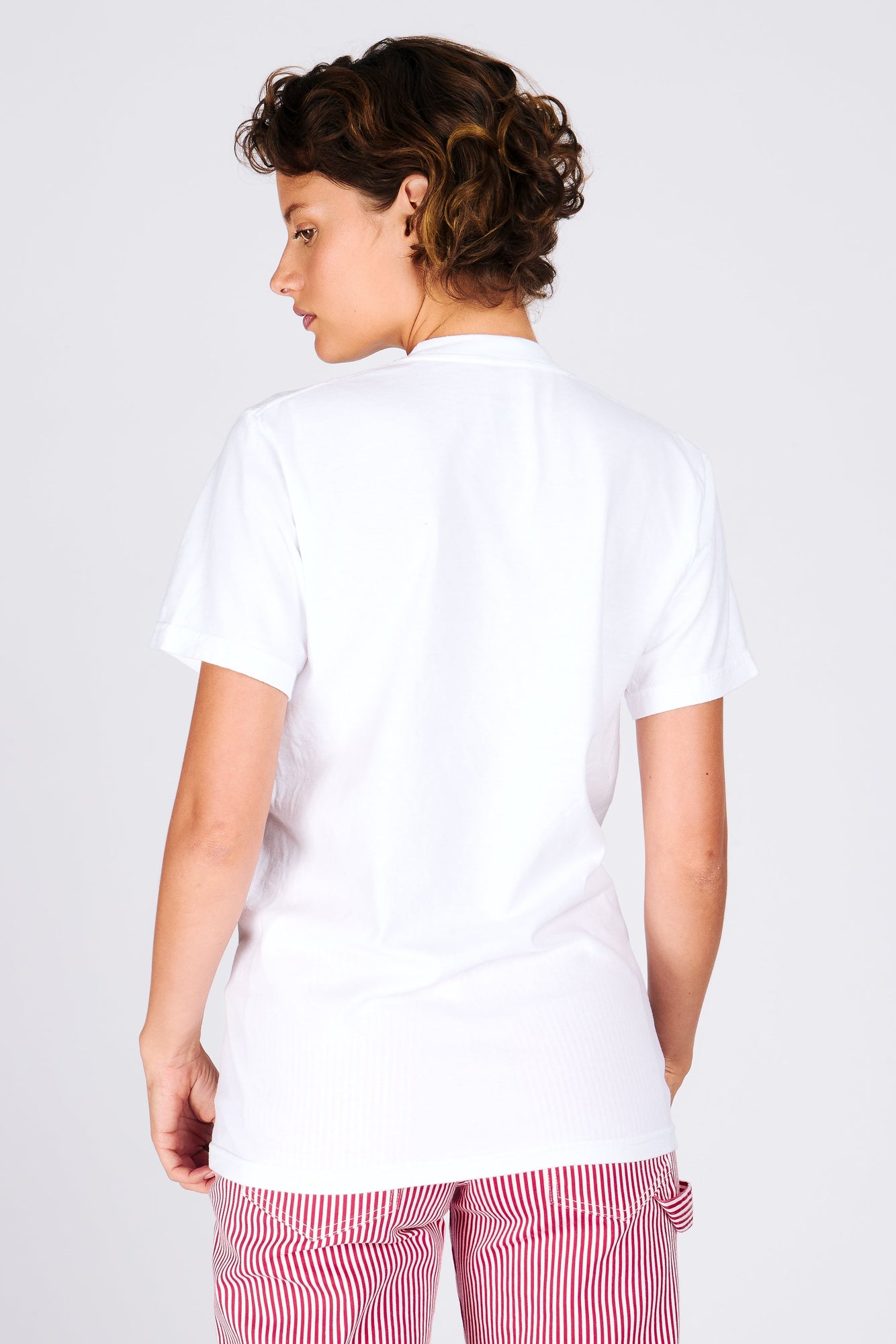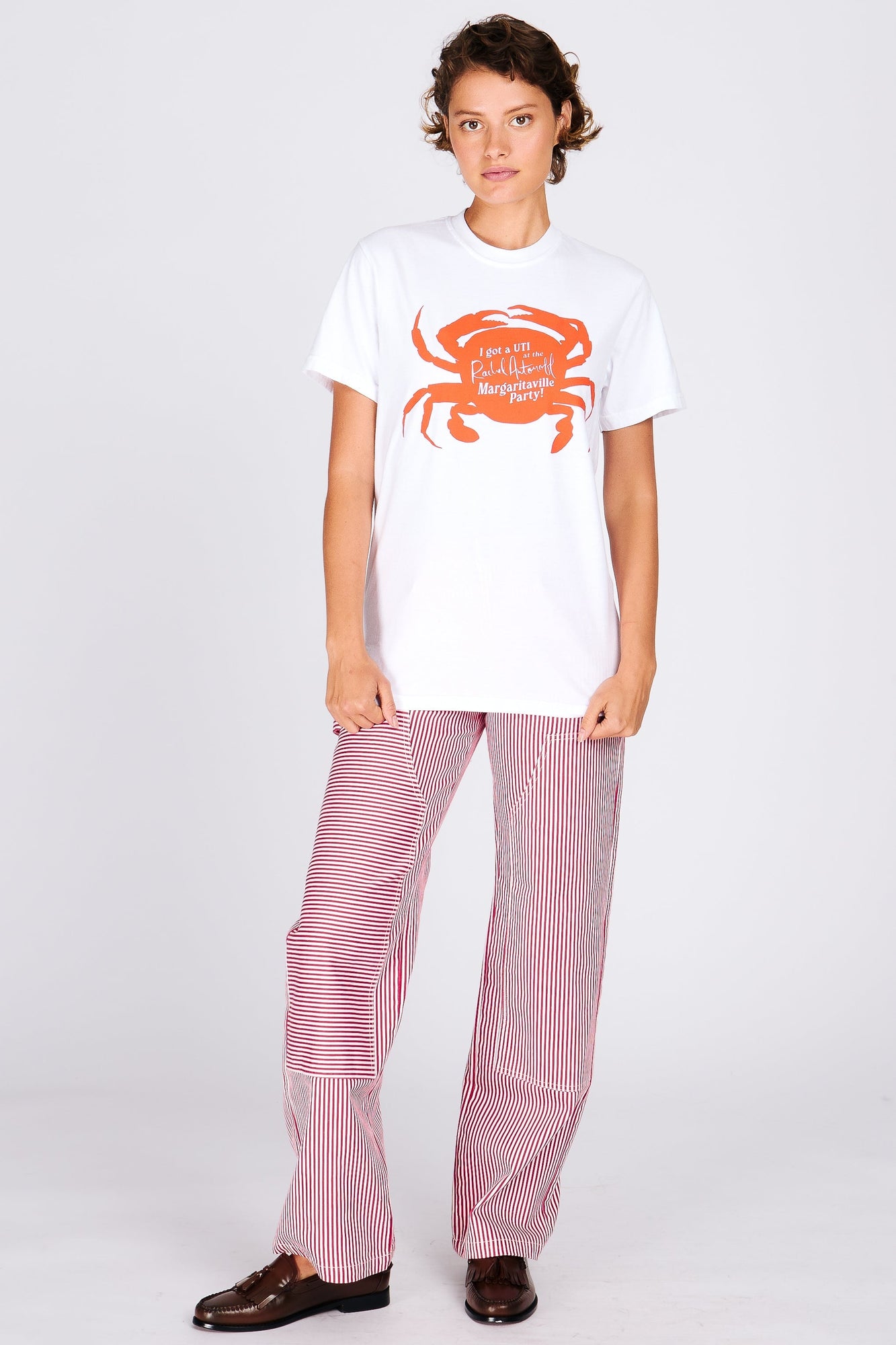 - Short-sleeve white tee with reddish orange crab graphic that reads "I got a UTI at the Rachel Antonoff Margaritaville Party!"