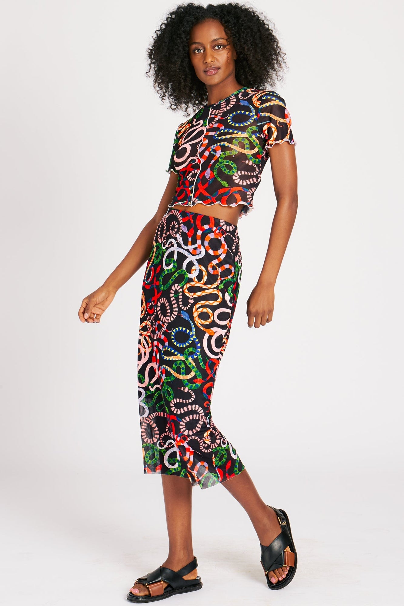 Stella ensures you'll demand respect, yearning, and perhaps a little fear at your next Greek pantheon-themed orgy-slash-cocktail-party. A Medusa's mane of colorful snakes adorns this slinky mesh top, which also features a body-skimming fit and playful raw hem. Pair with the matching Chelsea skirt and prepare to turn your crush to stone. (Because they'll get so hard... you get it.)
