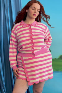 No one wants to be a doormat, but a beach towel? The feeling of hot sand beneath you and hot ass above? Aspirational! Live your fantasy in the Cupcake skort: resort-ready pink stripes and creamsicle orange piping bring OOO energy to our signature stretchy mini skort silhouette. Coordinate with the matching Cupcake cardigan, or top with the Twist Cone Pullover for a look that says "I've got sand in places you've only dreamed of."