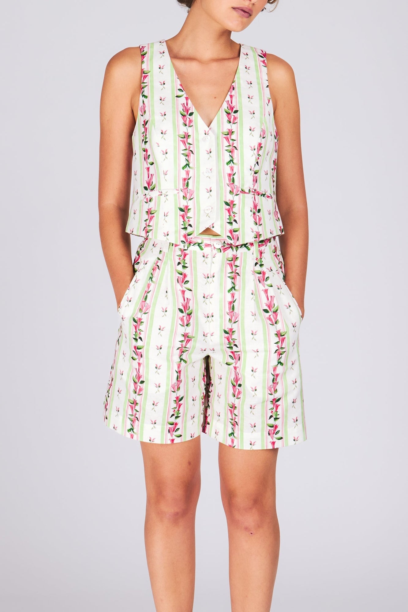 Wallpaper your ass like the architectural wonder it is! Our latest Kokomo short has the high waist and pleated front you know and love, plus an updated take on spring florals with a vintage-inspired wallpaper print. To keep things from getting too cutesy, soft pink and green blooms are balanced by Kokomo's boyish bermuda silhouette.