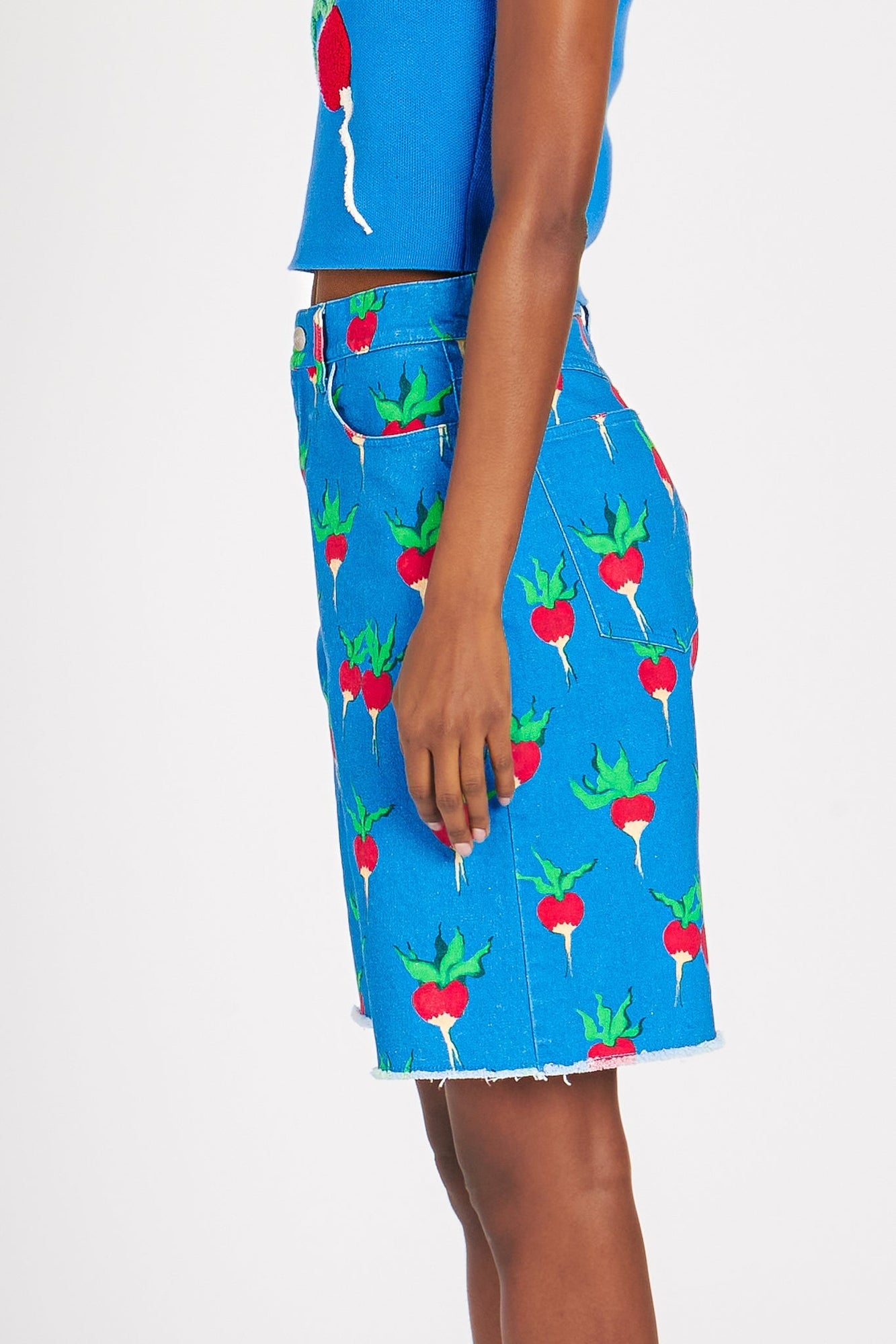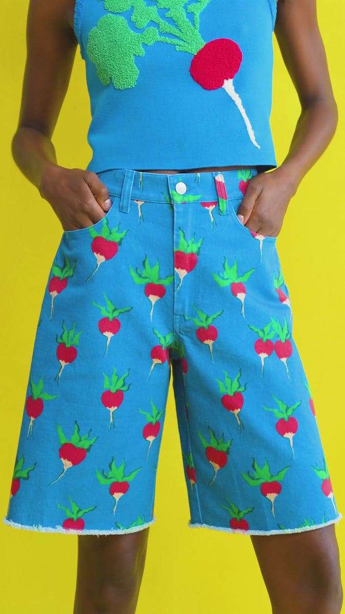 Put some roots on your stems in Morty, a short with high vitamin C! (Not really. Please don't eat our shorts.) Morty's true blue denim and knee-grazing raw hemline are a study in effortless cool, while the all-over radish print screams "Butter me like one of your French hors d'oeuvres."