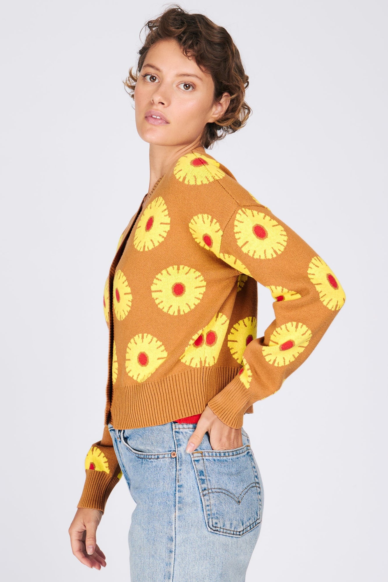 Pineapple truly has it all: a don't-fuck-with-me exterior, a sweet-sour flavor profile, and a reputation as the fruit of choice for citric acid aficionados and swingers alike. Our latest Ana cardigan invites you to enjoy all pineapple has to offer, without burning the roof of your mouth: this cropped sweater features plush 100% cotton, a slightly boxy fit, tortoiseshell buttons, and all-over pineapple rings reminiscent of your boozy nana's favorite baked good.