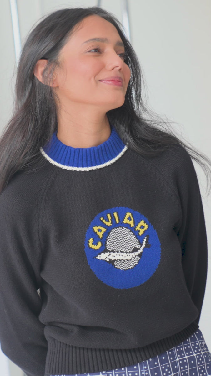 Not every sweater has "cuntiest heiress at the ski chalet" energy, and that's okay. For those of us who aspire to CHATSC, however, only our Caviar sweater will do. This 100% cotton fully-fashioned knit sports a thick ribbed hem, striped trim, and a larger-than-life caviar intarsia to put a Bond villain to shame.