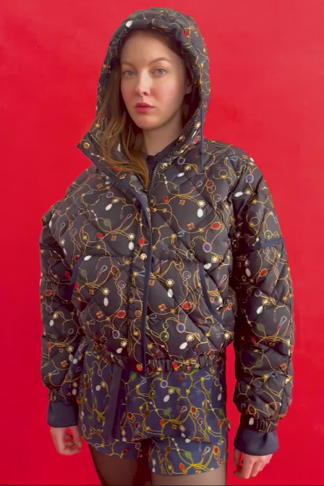 After your wealthy husband's terrible accident, you'll need something sophisticated enough for the burial but sexy enough for the wake. We've got your back! Our Ace Puffer features the cozy down-alterative puff and boxy hooded fit you know and love, plus our highest-carat print yet. Pairs great with a kicky boot and a generous life insurance policy.